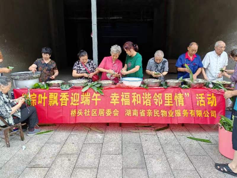 在端午节来临之际,桥头社区联合湖南省亲民物业服务有限公司于6月21日上午在桥头社区东成中心3、4栋前坪一起举办"粽叶飘香迎端午 幸福和谐邻里情"端午节主题活动。端午节是我们中华民族的传统节日,我们用粽子来纪念屈原,来纪念和传承伟大的民族精神。而如今不需要出门手机上就可以买到商品的时代,邻里之间围聚在一起动手包着棕子实属难得机会。