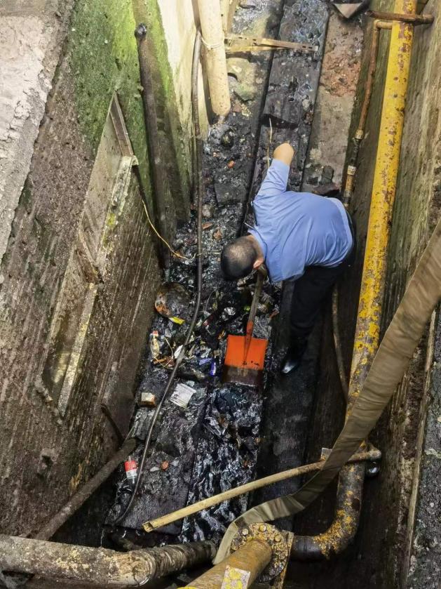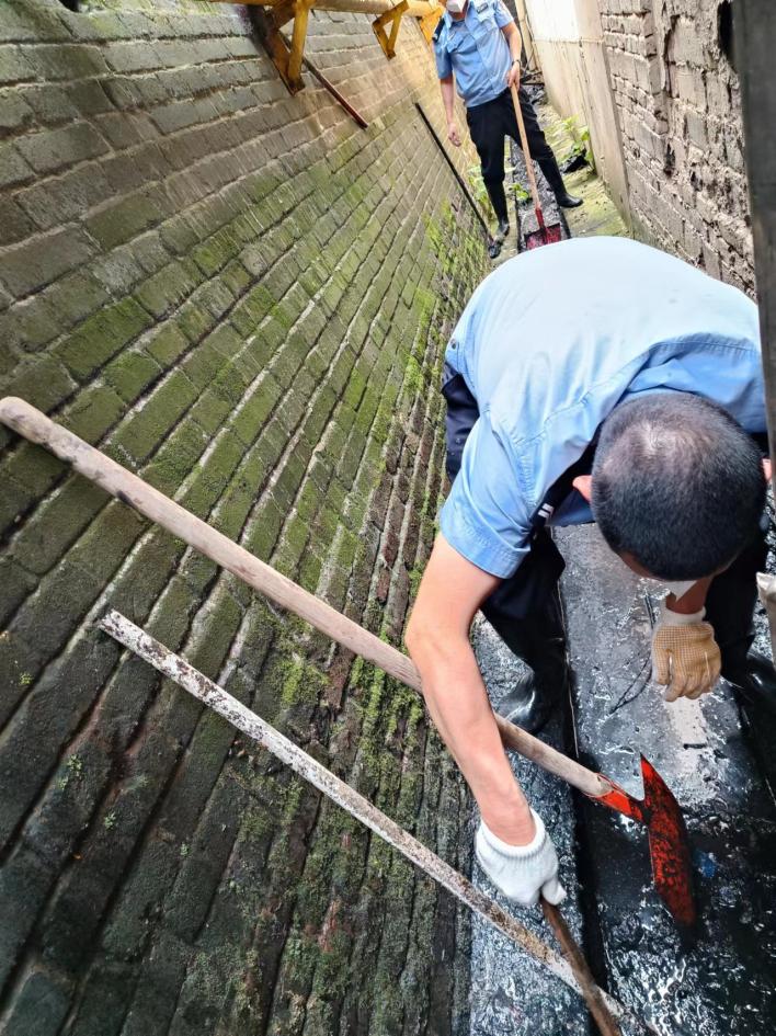2024年度文明城市创建工作持续开展,操坪社区联点共建单位株洲市公安局为落实"社区吹哨、部门报道"工作机制,于5月16日上午,由政治处宣传科领导带队,集合芦淞分局建设派出所8名民辅警,来到社区居民反映强烈的操坪巷护坡下操坪10栋与房产大厦围墙包夹的卫生死角,一条长约20米,宽度不足1米的下水沟巷道进行环境卫生清理。这条巷道因包夹在两个居民区之间,非常狭窄且两端均被堵死,只有侧面一家服装仓库开了一道只能容一人侧身通过的小门,且平时都是封闭的。由于保洁人员平时无法进入这里打扫,下水沟已被垃圾和污泥堵塞,散发着阵阵难闻的气味,居民路过时都得捂住鼻子。干警们和社区工作人员、志愿者一道穿上长雨靴,穿过窄门,进入转身都比较困难的巷道内先是徒手捡拾垃圾,然后用铁铲将沟内污泥铲入橡胶桶,一桶一桶传递转运到巷外,再用木棍铁钩等工具在污水中疏通沟渠,最后借助消防栓水带将污垢和臭气彻底冲洗去除。大家埋头苦干了一上午,清理出来的污泥和垃圾装满三个大垃圾桶,警服都已被汗水湿透,还沾上了污泥脏渍,虽然此时队员们又脏又累,但看到被清理干净的巷道,听到路过居民的称赞和感谢,都觉得特别开心和满足。