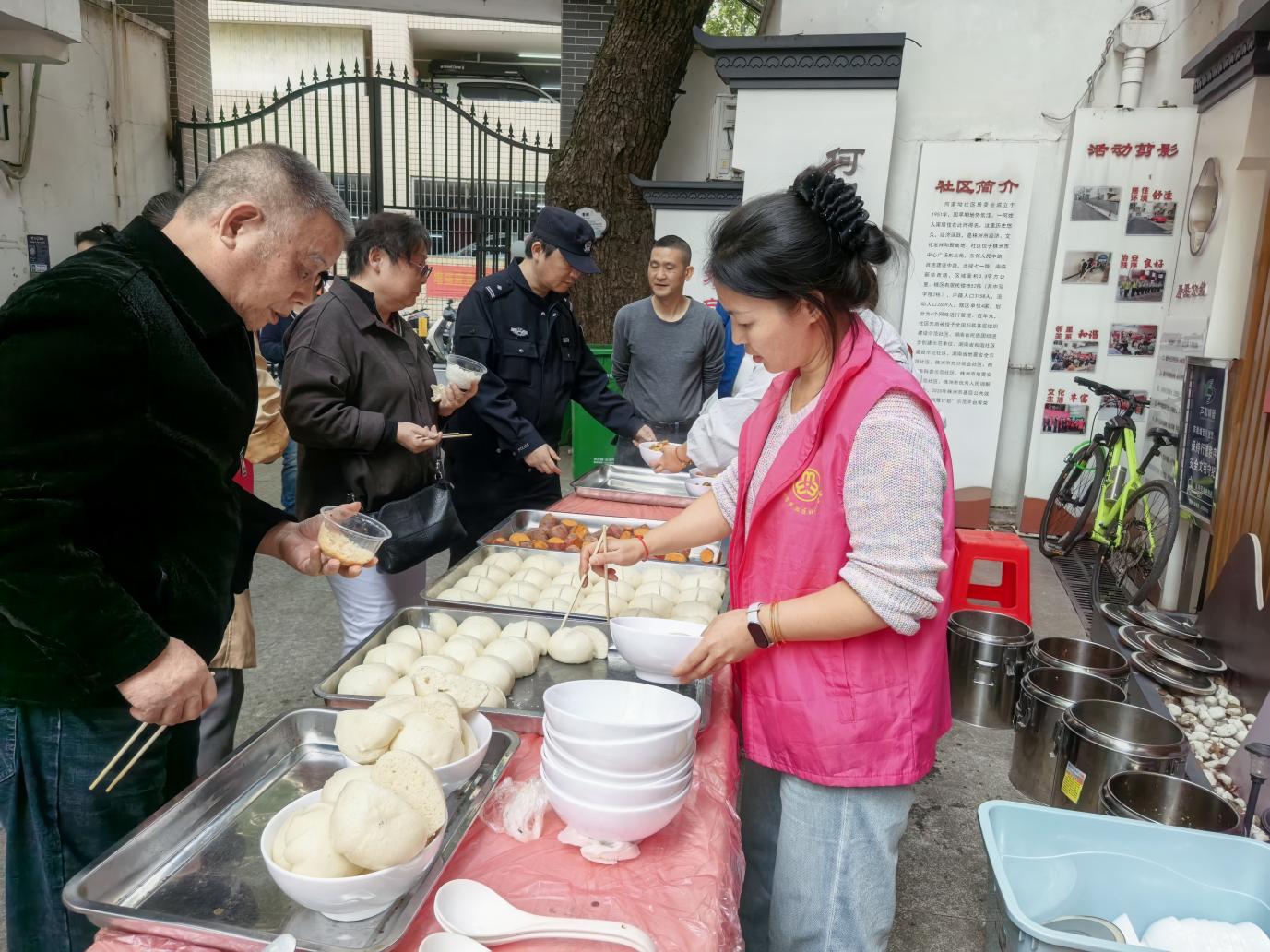 活动现场,社区前坪烟火气升腾,暖意融融。社区准备的菜品琳琅满目,居民们更是端出自家拿手好菜——“我这道排骨炖萝卜炖了两个小时,大家尝尝我的手艺如何!”“清炖土鸡是我的绝活,保证入味!”一道道家常菜热气腾腾,承载着居民的心意与厨艺。文艺巷商户带来的甜品、特色汤等招牌菜更是引发阵阵赞叹。