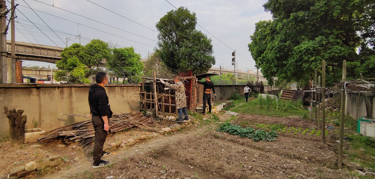 徐家桥社区铁路沿线靠近居民区,周边居民较多,许多居民将沿线的土地变成了自家的菜园,甚至围墙边搭建棚子存放劳动工具。了解情况后,社区工作人员找到相关人员,一家一户做工作,跟向居民宣传铁路沿线安全工作,告知铁路沿线管理的相关规定,请他们配合社区做好铁路安全工作。与此同时,社区将工作情况上报街道党工委,请求办事处牵头对建筑物进行拆除。