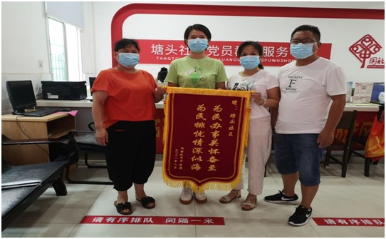 “非常感谢塘头社区喻书记和志愿者们,感谢你们在我女儿集中隔离、我们夫妇居家隔离时,对我们在物质上和精神上无微不至的帮助”,8月24日上午,荷叶一村居民袁某到社区,送上了“为民办事关怀备至,为民排忧情深似海”的锦旗,以感谢疫情防控期间社区对她们家的帮助。