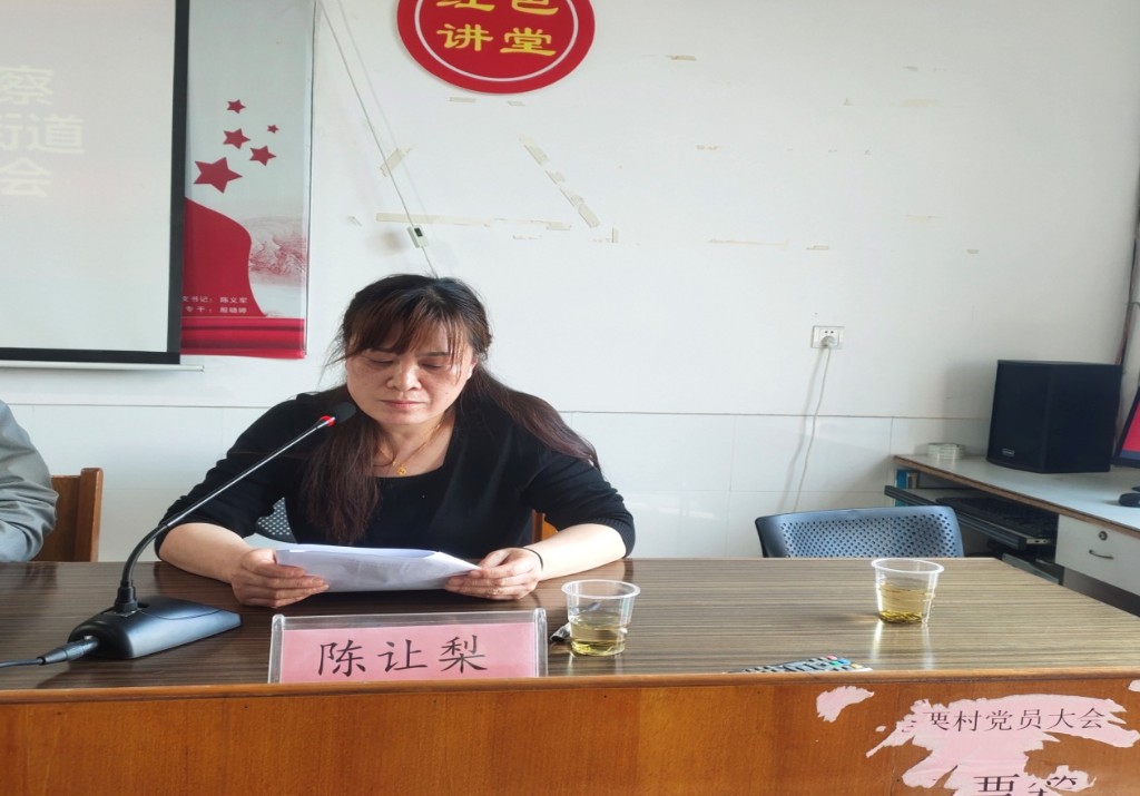最后,坚栗村党委书记陈让梨作了表态发言。一是充分提高认识、全面统一思想。村支两委必须站在政治全局的高度,充分重视开展这次巡察工作的重大意义,高度重视这次巡察工作、主动配合接受巡察。二要精心组织安排,全力搞好配合。巡察工作是一项政治性和纪律性很强的工作,积极主动配合巡察组工作,自觉接受监督检查,是我们政治责任和应尽的义务,也是党员干部尤其是领导干部党性原则。三要诚恳接受监督,扎实抓好整改。要把这次巡察工作看成一次很好的自我剖析、自我认识、自我提升的机会,对问题不回避,对矛盾不遮掩,勇于面对问题,揭露问题,要建立问题清单,明确责任人,逐项对照检查,务必做到件件有着落,事事有回应,确保此次巡察小组工作圆满完成,取得实效。