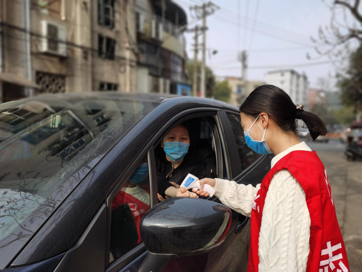 董家塅街道青年团干在劳动社区值守点对过往行人检测体温