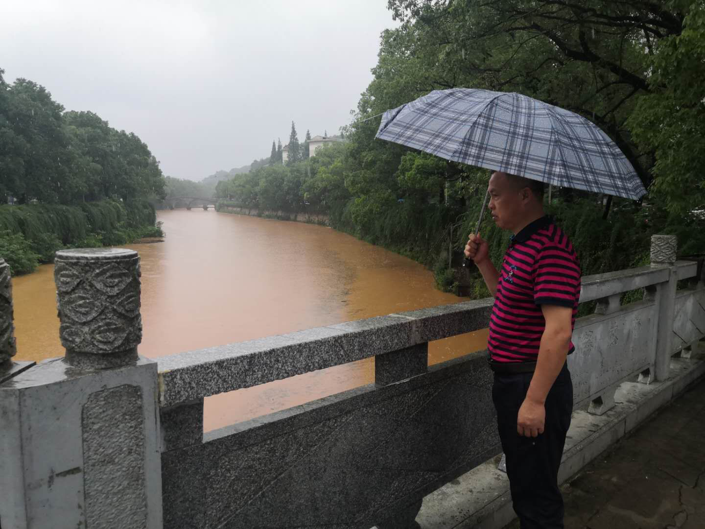 董家塅街道党工委副书记、办事处主任陈小伍查看枫溪港沿线汛情
